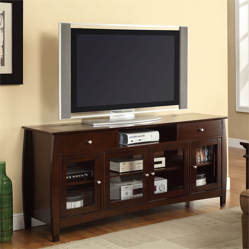 | Coaster - TV Stands - 700693 - Featuring a CONNECT-IT power drawer for charging iPods, cell phones and other small electronics, this TV console accommodates all of your digital needs without sacrificing style and class. An open compartment near the top of the piece is perfect for a DVD player or gaming component. Four glass drawers close over shelves perfect for storing additional electronics, movies, books and decorative items. Designed with simple lines and a sleek look, this console easily updates and refreshes your home decor. Specifications: Overall Product Dimension: 27"" H x 18"" W x 60"" D ; Weight: 149 lbs..