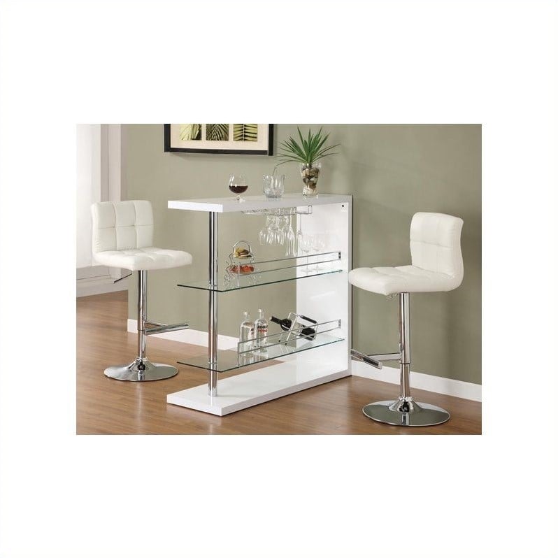 | Coaster - Pub Sets - 1001671203563PcPKG - Coaster Contemporary Adjustable Chrome Bar Stool in WhiteChrome finish pedestal and footrest; White seat; Padded straight line roll back; Contemporary style; Can only be ordered in quantities of 2. Specifications:Overall product dimensions: 36.25 - 41.5"" H x 18"" W x 18""D; Seat Depth: 15.25"" D. Coaster Bar Table in WhiteTwo glass storage shelvesFinished in WhiteChrome accentsSleek contemporary styleSophisticated lookSpecifications:Overall Product Dimensions: 43.5"" H x 15.75"" W x 47.25"" D