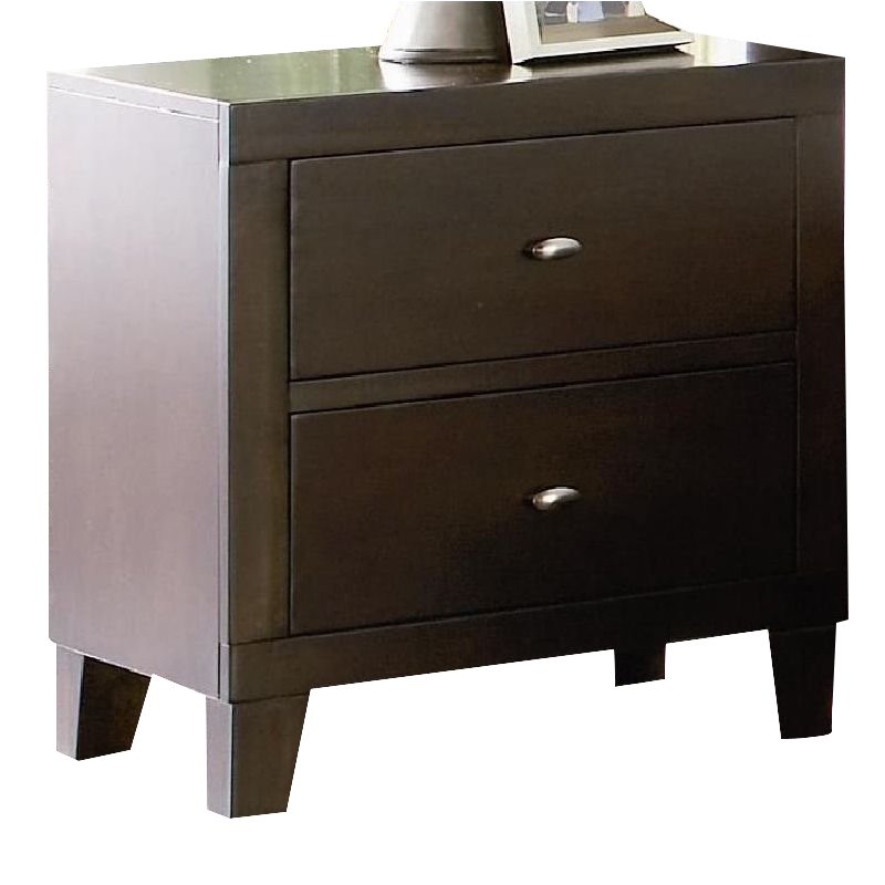 | Coaster - Nightstands - 201512 - Deep brown finish bathes each pieceContemporary styleBrushed nickel finish hardwareTwo Drawers with Brushed Nickel Finish HardwareAll wood constructed drawers with English dovetail jointsMetal on wood center drawer glidesSpecifications:Overall dimensions: 24H x 22W x 16D inchesWeight: 50.60 lbs.