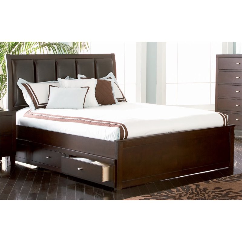 | Coaster - Beds - 201511QSKIT - Finish: Dark Brown, CappuccinoMaterials: Faux LeatherTransitional design that makes any room a stylish oneFeatures bold black leatherette wraps the padded headboard with underbed storage unitUnderbed storage maximizes bed spaceSpecifications:Overall Product Dimensions: 49"" H x 64.75"" W x 86.5"" DProduct Weight: 170 lbsUnderbed Storage Dimensions: 10.25"" H x 80"" W x 17.75"" DDrawer Panel Dimensions: 6"" H x 23.75"" W x 0.75"" DInner Drawer Dimensions: 4.25"" H x 23.38"" W x 15.38"" D