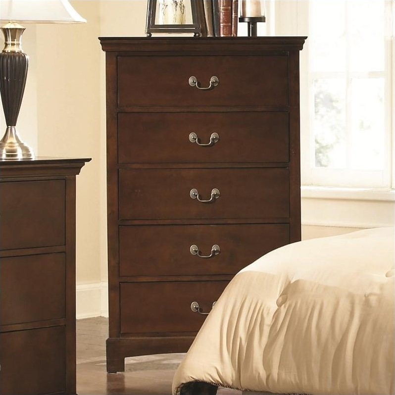| Coaster - Chests - 202395 - Wood & Finish: Espresso Brown FinishStyle: TransitionalStorage: Five DrawersHandles & Hardware: Bronze Colored Handle Drawer PullsCase Detail: Beveled Edges and Square LegsDrawer Suspension: Center Middle GlidesSpecifications:Overall Product Dimensions: 48.25"" H x 31.5"" W x 15.75"" D Weight: 73.86 lbs.